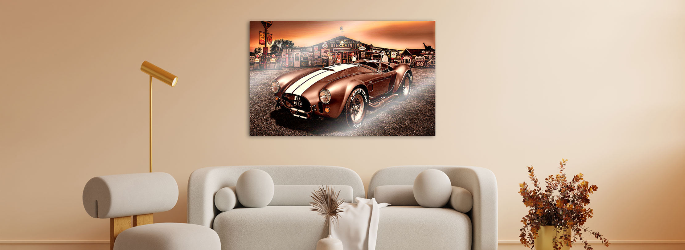 Dieses Bild ist für Menschen, die mehr in einem Auto sehen als nur ein Fortbewegungsmittel. Die Cobra ist ein Stück Automobilgeschichte, ein Symbol für kompromisslose Leistung und Design. Auf gebürstetem Alu Dibond wird daraus ein echtes Kunstobjekt.