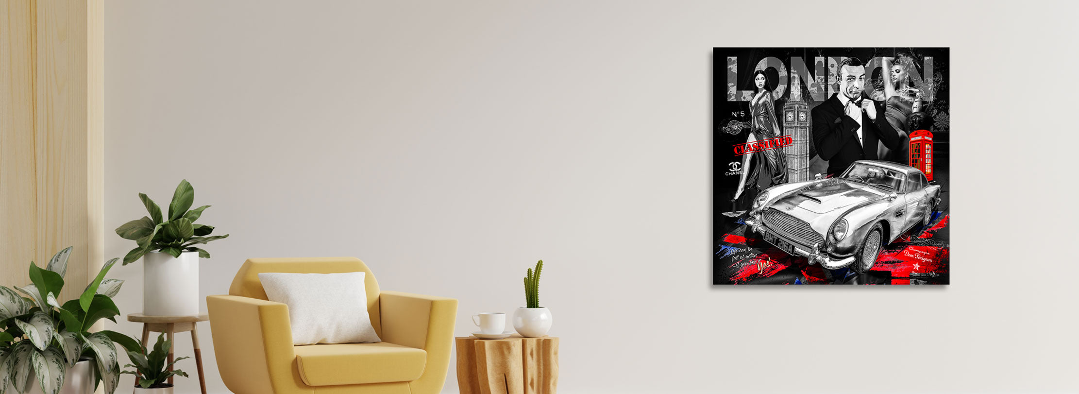 Kein Poster, kein Massenprodukt, sondern ein edles Wandbild auf einem Material, das zum Motiv passt. Klar, direkt, mit Charakter – genau wie Bond selbst.