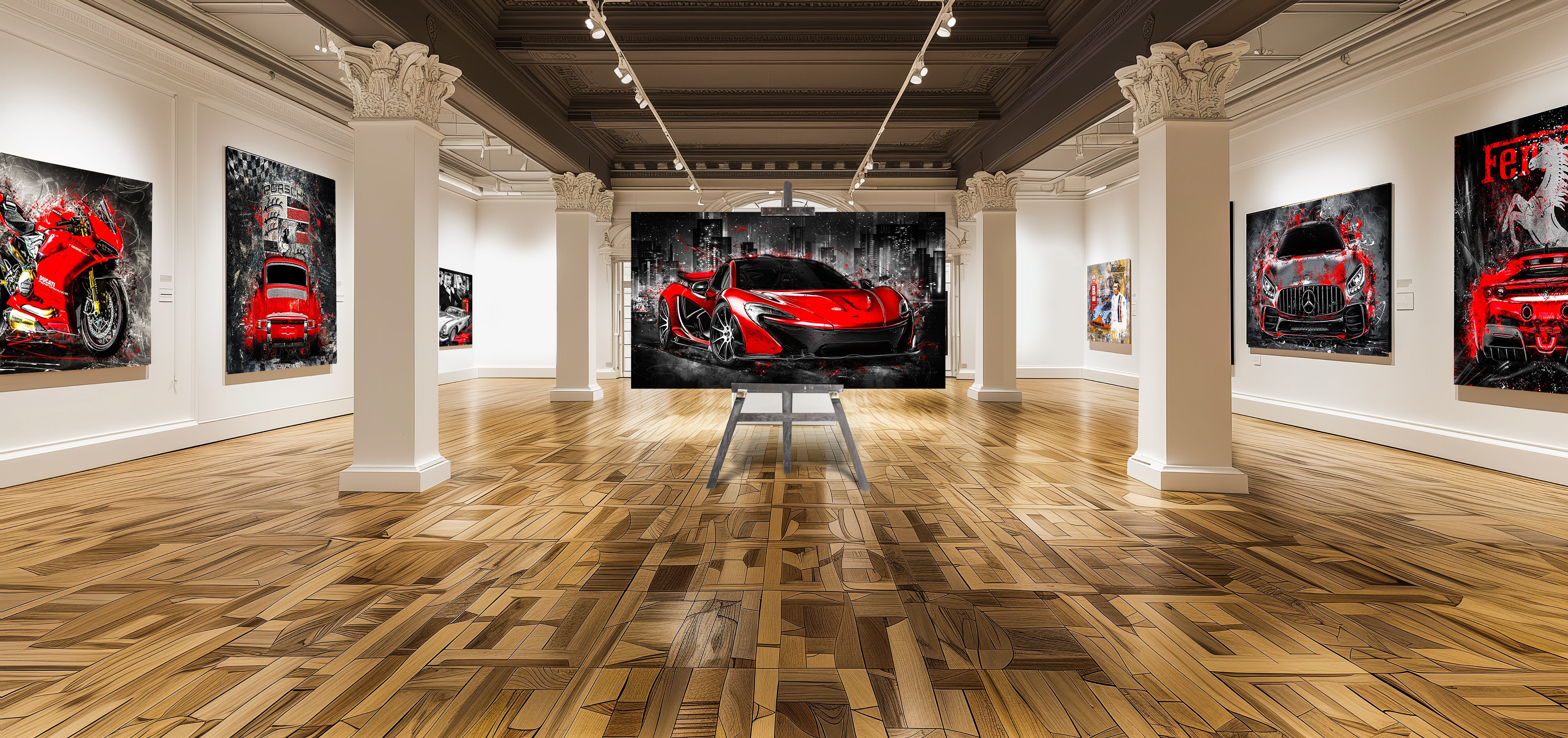 Von der scharfen Haifischnase bis zum aktiven Heckflügel erzählt jede Linie von Downforce und Speed. Auf strukturierter Künstlerleinwand wirkt der Carbonglanz zurückhaltend, aber präsent. Ob P1, 720S oder der klassische F1 – das Auge schaut nicht nur, es folgt den Kurven. Das Motiv bleibt klar, ohne in grellen Farben zu ersticken.